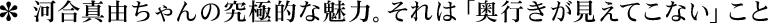 でもその時に「2年前も旬を感じました」とお伝えしました。今もその「旬」は続いていると思いますが。河合まゆちゃんの究極的な魅力。それは「奥行きが見えてこない」ことだと撮影を終えて実感しました。